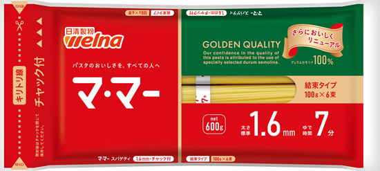 生パスタは、乾麺のスパゲティに比べてゆでる前から水分を含んでいるため、中心部にも水分が含まれ、水色になっています。中心部から外側に向けての緩やかな水分勾配が、生パスタのもちもちとした食感を特徴づけています。