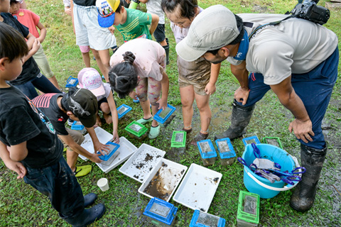 只見町に広がる豊かな里地里山の自然環境ですが、年々休耕田が増えています。田んぼの様な湿地環境は生物を育む重要な場所のため、泥んこ遊びをしながら休耕田を湿地に変えるという生物多様性に繋がる取組みを行い、里地里山の自然環境の重要性を学びます。泥んこ遊びの最後には生きもの探しも行い、前年と比べどれだけ生きものが増えたかなどを見える化することで、自分達の取組みの成果を実感しています。