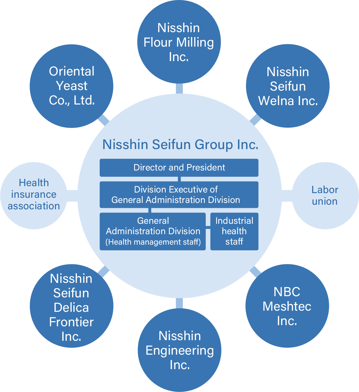 Health management measures are implemented by the Division Executive of the General Administration Division and health management staff in the General Administration Division in collaboration with the corporate health insurance association and the labor union, under a structure headed by the President.