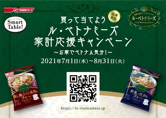 日清製粉グループの日清フーズ株式会社(社長:小池 祐司)は、今春発売した冷凍食品「ル・ベトナミーズ」シリーズのフォーを購入して応募いただくと、抽選でデジタルギフト券が当たる「買って当てよう ル・ベトナミーズ 家計応援キャンペーン~お家でベトナム気分!~」を本年7月1日(木)より実施します。