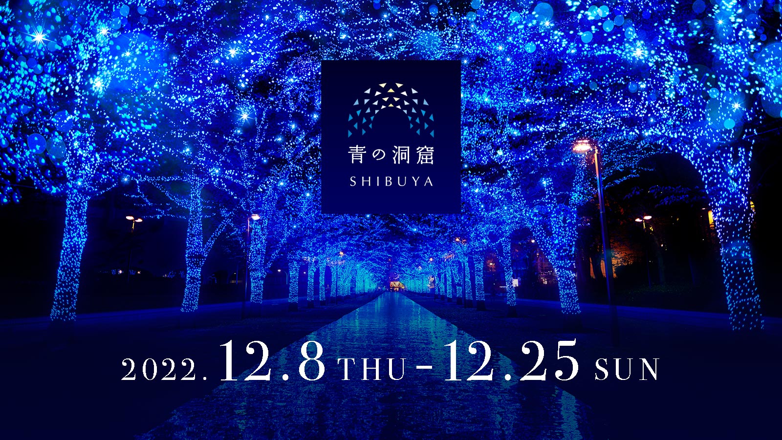 『青の洞窟 SHIBUYA』は、日本有数の情報発信都市・渋谷が青色LEDによって彩られるイルミネーションイベントで、2019年以来3年ぶりに開催が決定しました。渋谷公園通りから代々木公園ケヤキ並木までを青色のイルミネーションで彩り、ご来場いただいた皆様を幻想的な「青の洞窟」の世界へ誘います。また、今年は、代々木公園ケヤキ並木の会場に巨大なクリスマスカードが設置されます。Illumination Mapping(イルミネーション マッピング)※により、動く光のメッセージが彩られ、オルゴールの音楽に合わせた新しい形のクリスマスカードをお楽しみいただくことができます。