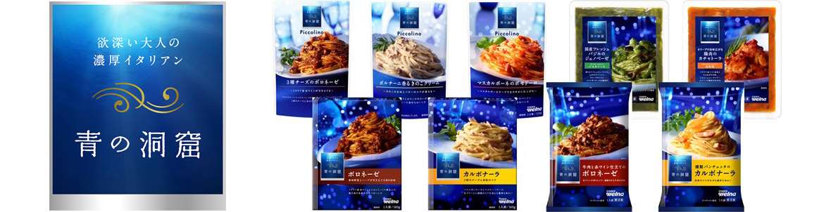 当社の「青の洞窟」ブランドは、1995年に誕生し、“欲深い大人の濃厚イタリアン”をコンセプトに、パスタ・パスタソース・調理用ソース・冷凍パスタ等の豊富な製品ラインアップを展開しています。