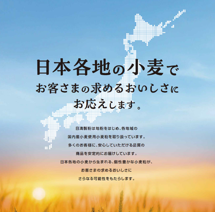 当社は、国内産小麦の積極的な取扱いを通じて、国内産小麦100%使用の小麦粉の価値をさらに広げ、地域とともに新たな食文化の創発を目指してまいります。