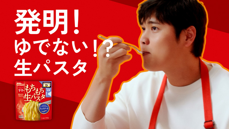 CM冒頭では、「マ・マー」のブランドカラーである赤色を基調とした世界観の中に大谷選手が登場します。生パスタならではのもちもちとした食感を表現するダイナミックな映像とともに、「おうちで生パスタ時代はじまる。」と、家庭用パスタ市場での“新時代の幕開け”を宣言します。最後には、「マ・マー」の常温・冷凍の両カテゴリーからそれぞれ新発売したもちもち食感の“生パスタ”、「もちもち生パスタ」シリーズを印象的に訴求しています。