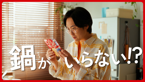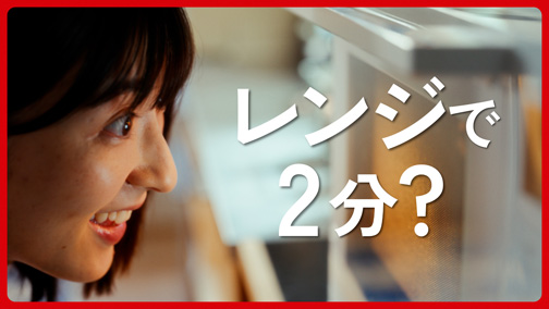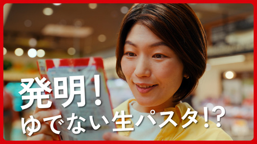 女性がいつものスーパーでパスタを選んでいると、「マ・マー レンジで2分 もちもち生パスタ」を見つけ、ゆでない生パスタに衝撃を受けます。また、男性がパスタをゆでるためにお湯を沸かしていると、その生パスタはゆでる必要がなく、鍋がいらないことに気づき、驚きます。更にシーンが切り替わり、女性が電子レンジの前で、たった2分のレンジ調理で生パスタができあがる簡便さに感動します。