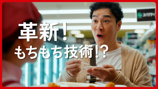いつものスーパーの冷凍食品売り場で、「マ・マー もちもち生パスタ」の試食をした男性が、生パスタのもちもちとした食感とおいしさに驚きます。また、カップルがおうちで「マ・マー もちもち生パスタ濃厚ボロネーゼ」を食べ、もちもち食感の生パスタと、スパイスが効いた濃厚なボロネーゼソースがマッチしたおいしさに感動します。