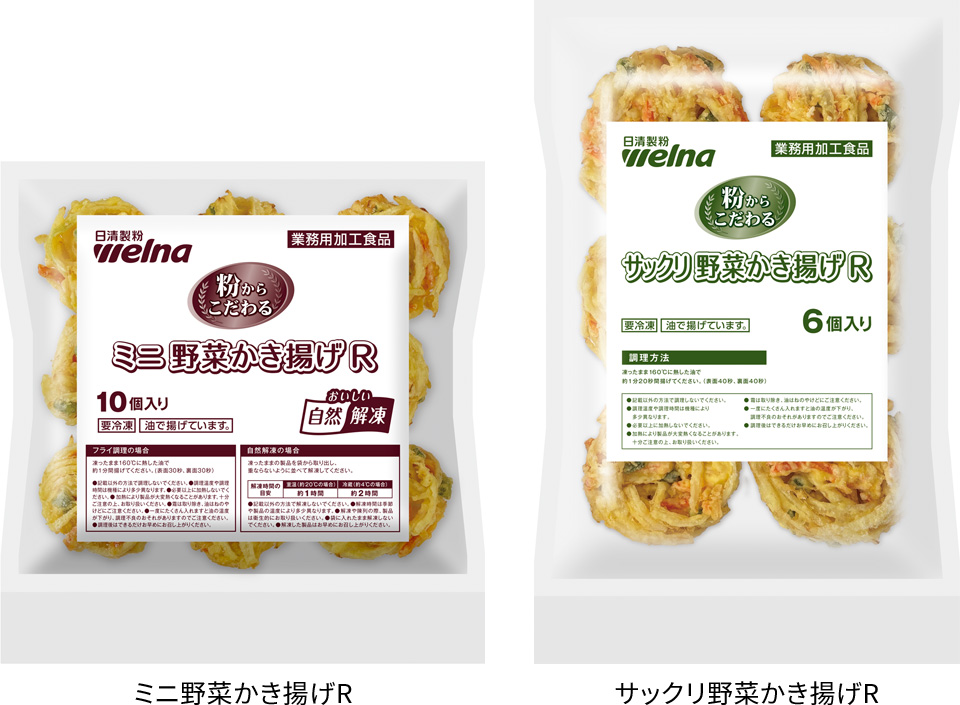 また、レギュラーサイズの「サックリ野菜かき揚げR」(直径約8.5cm・高さ約3cm)は、大型冷凍庫の設置が困難な外食店舗の調理場でも扱いやすいよう、小袋包装(6個入り/袋)に変更しました。一般に手間のかかるかき揚げですが、本製品なら短時間のフライ調理のみで提供が可能です。