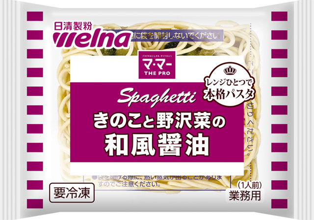 レンジ調理だけで手軽に提供できる「マ・マー THE PRO レンジ用スパゲティ」シリーズに、かつお風味の和風醤油メニューが新たに加わります。具材に、ぶなしめじ・野沢菜・ベーコンを使用し、具材感のある一品をさらっと食べやすい醤油味に仕上げました。