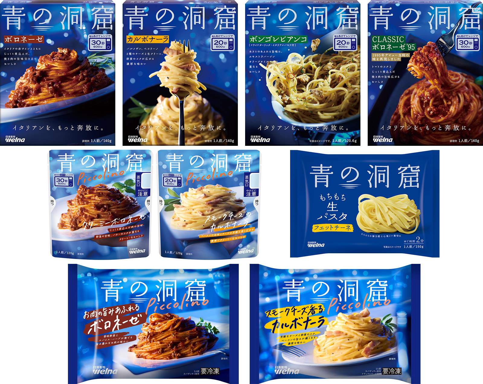 これまでの「青の洞窟」ブランドの世界観や本格的な味わいはしっかりと受け継ぎつつ、パスタソース製品のレンジ対応化や品質改良、生パスタの新シリーズ発売等、日本におけるイタリアンのイメージ変化に合わせて味わいやラインアップを強化し、パスタの楽しみ方をさらに広げます。新しくなった「青の洞窟」は、これからも確かな価値をお届けするブランドとして進化し続けます。