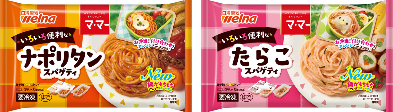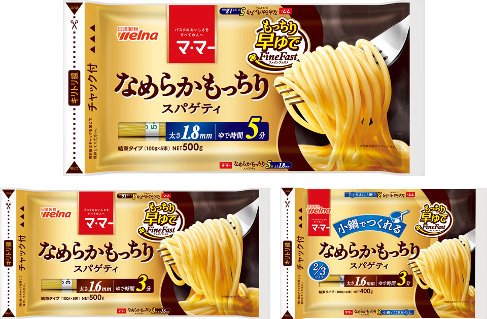 「マ・マー いろいろ便利なスパゲティ」は、お弁当はもちろん、付け合わせやアレンジメニュー等、汎用性が高く、消費者の皆様に長くご愛用いただいているシリーズです。今回、従来のおいしさはそのままに、麺がもちもちになってリニューアル。普段の食卓に、お弁当に、いろいろ使える便利な小分けトレイ入りのミニスパゲティ(3個入)です。