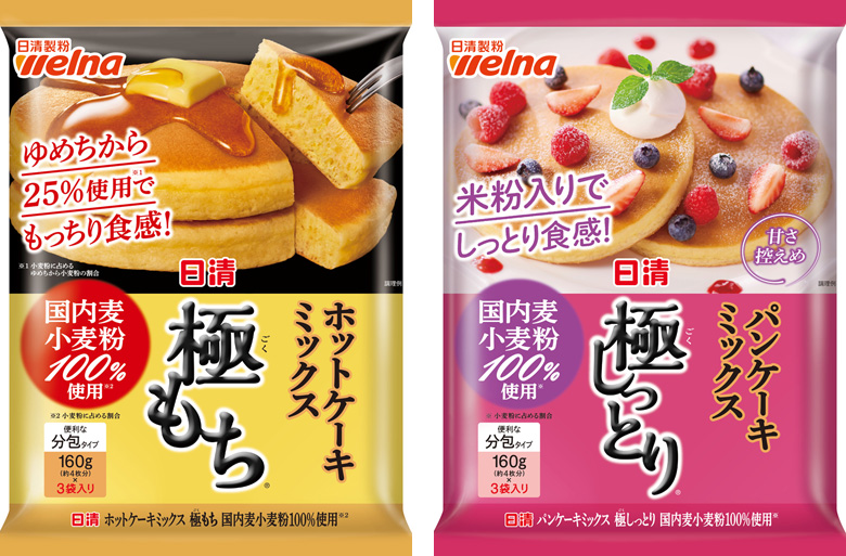 | リニューアル | 日清 ホットケーキミックス 極もち® 国内麦小麦粉100%使用 |