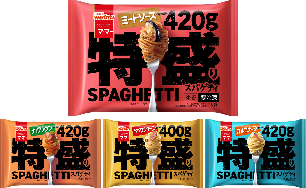 冷凍大盛りパスタカテゴリーの市場規模(金額)は拡大傾向にあり、直近は前年比126%※1と大幅に伸長しています。 こうした市場環境の中、2025年夏に全3品のラインアップで発売した「マ・マー 特盛りスパゲティ」は、濃くてクセになる味付けとたっぷりのボリュームで、「超満足の食べ応え」をお届けするシリーズです。「マ・マー 特盛りスパゲティ」シリーズは、「大盛りでも量が足りない」と感じている方※2だけでなく、1人前をご家族で分けて召し上がる方からもご支持をいただいています。今回、業界最重量級※3の420gで、男性人気もNo.1※4の王道「ミートソース」をラインアップに追加します。「マ・マー THE PASTA 濃厚ボロネーゼ」(275g)の約1.5倍のボリュームで、濃厚ソースがもちもち麺に絡み、にんにくの風味が食欲をそそる、あと引くうまさがやみつきになるメニューです。