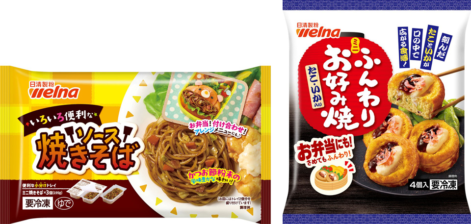また、ロングセラー製品「ふんわりミニお好み焼 たこ・いか入り」は、お弁当利用の訴求を高めたパッケージに刷新します。お弁当にぴったりのミニサイズのお好み焼(4個入)です。