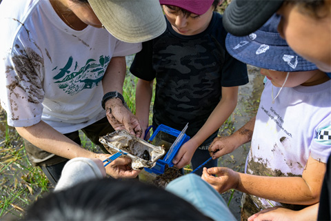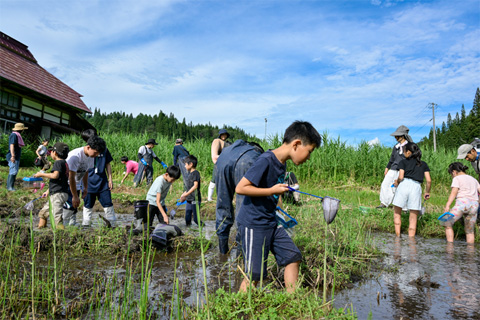 只見町に広がる豊かな里地里山の自然環境ですが、年々休耕田が増えています。田んぼの様な湿地環境は生物を育む重要な場所のため、泥んこ遊びをしながら休耕田を湿地に変えるという生物多様性に繋がる取組みを行い、里地里山の自然環境の重要性を学びます。泥んこ遊びの最後には生きもの探しも行い、前年と比べどれだけ生きものが増えたかなどを見える化することで、自分達の取組みの成果を実感しています。