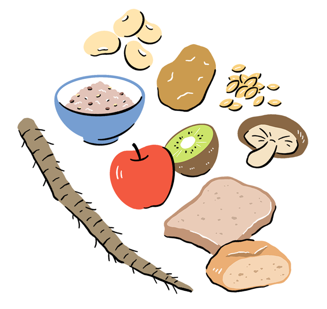 発酵性食物繊維を多く含む食品には、豆類、イモ類、全粒穀物、キノコ、ゴボウなどの野菜、そしてキウイやリンゴなどの果物があります。おすすめは主食を工夫すること。例えば、玄米ご飯、麦めし、雑穀ご飯、全粒粉のパンなどを取り入れ、1日3食のうち1食は主食を「茶色」系統(未精製の穀類)にすると良いでしょう。白米や精製小麦のパン、麺類は食物繊維が少なく、かといっておかずだけで1日の十分な量を摂るのは難しいためです。